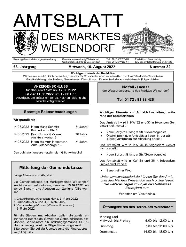 AMTSBLATT DES MARKTES WEISENDORF Herausgeber und Anzeigenverwaltung:Gemeindeverwaltung Weisendorf, Gerbersleite 2, 91085 Weisendorf63. JahrgangTel.: 09135/712028 Fax: 09135/712044Redaktion: Frau Herbig
