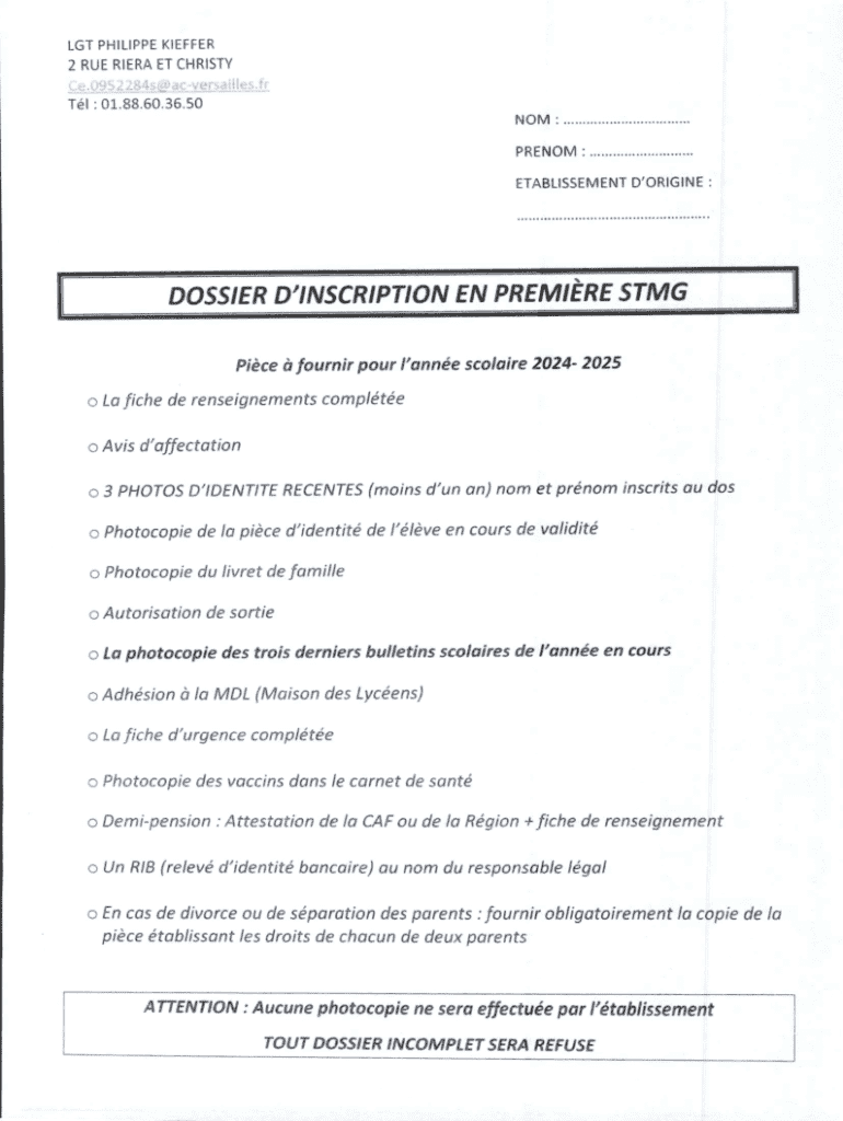 Le dossier d'inscription au lycée Philippe Kieffer doit être rempli avec les informations personnelles de l'élève, les relevés de notes précédents et les pièces justificatives demandées.