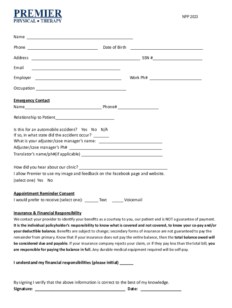 NPP 2023Name ___ Phone ___Date of Birth ___Address ___ SSN #___ Email___Employer ___Work Ph# ___Occupa on ___ Emergency Contact Name___ Phone# ___ Rela onship to Pa ent___ Is this for an automobile