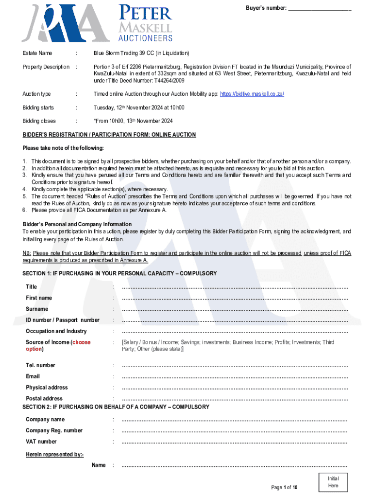 This document is a participation form for prospective bidders who wish to register for an online auction conducted by Peter Maskell Auctions. It outlines the requirements for bidding, including personal information, compliance with FICA regulations, and acknowledgment of the auction rules. Bidders must complete this form to participate in the auction of immovable property located at Portion 3 of Erf 2206 Pietermaritzburg, KwaZulu-Natal.