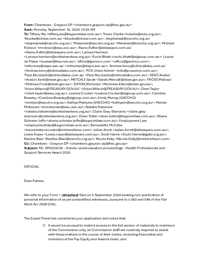 This document is an application submitted to the Fair Work Commission seeking suppression orders to protect the personal information of lay witnesses involved in the Gender Undervaluation proceedings related to the Health Professionals and Support Services Award 2020. The application aims to ensure that the identity and personal details of the witnesses remain confidential to encourage participation and provide necessary evidence for the case.