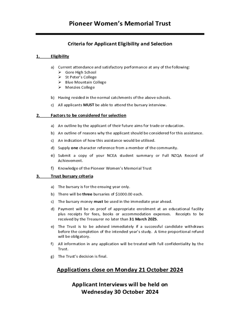 This document outlines the criteria for applicant eligibility and selection for the Pioneer Women’s Memorial Trust bursaries available to school leavers in 2024. It includes application requirements, bursary details, and information on selection factors, confidentiality, and decision-making processes.