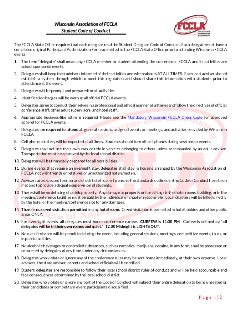 Get the free Wisconsin Fccla Student Code of Conduct - dpi state wi