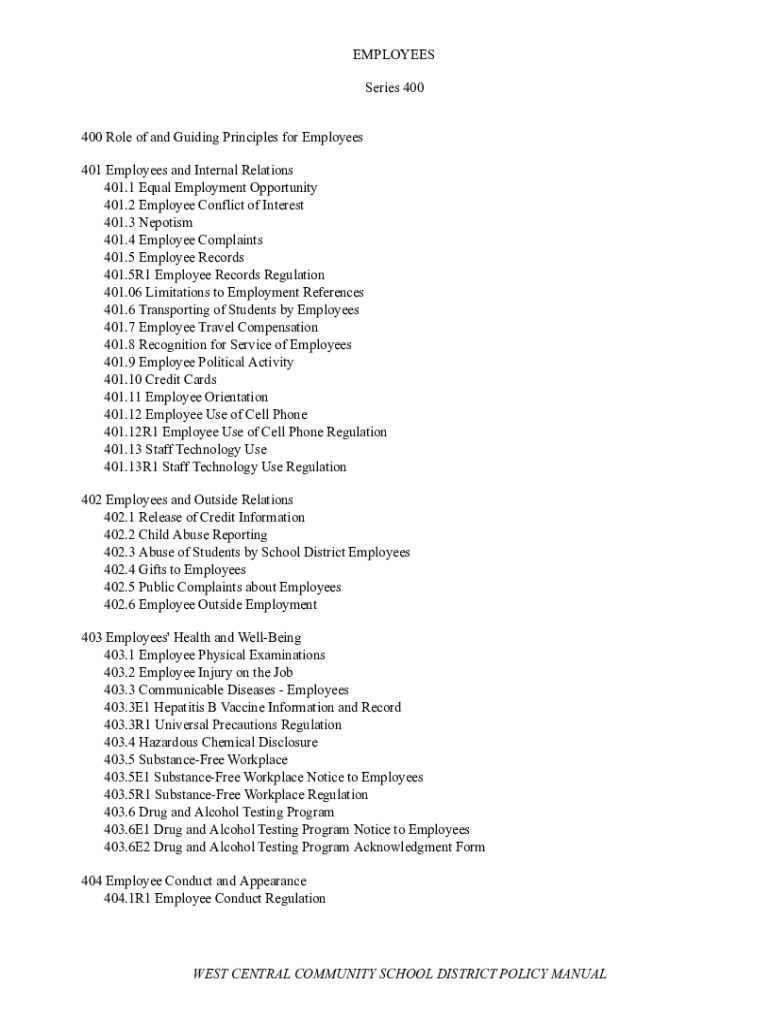 EMPLOYEES Series 400 400 Role of and Guiding Principles for Employees 401 Employees and Internal Relations 401.1 Equal Employment Opportunity 401.2 Employee Conflict of Interest 401.3 Nepotism 401.4