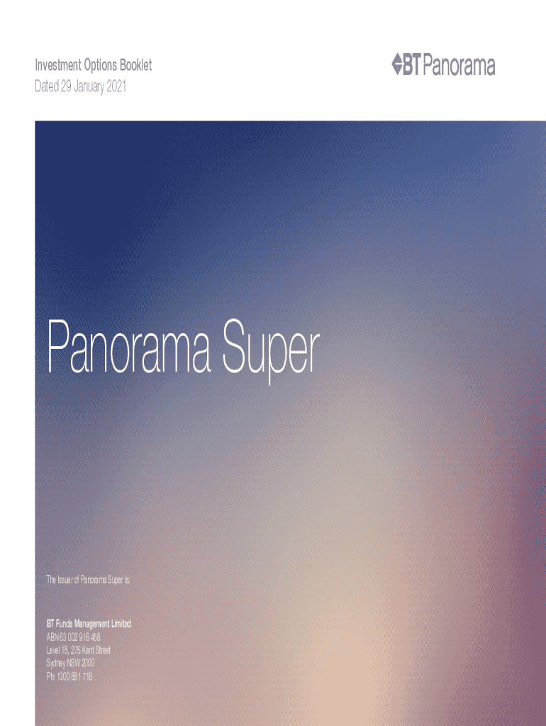 Investment Options Booklet Dated 29 January 2021Panorama Super The Issuer of Panorama Super is:BT Funds Management Limited ABN 63 002 916 458 Level 18, 275 Kent Street Sydney NSW 2000 Ph: 1300 881