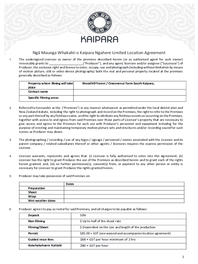 Ng Maunga Whakahii o Kaipara Ngahere Limited Location Agreement 1.The undersigned Licensor as owner of the premises described herein (or as authorised agent for such owner) irrevocably grants to (Producer),