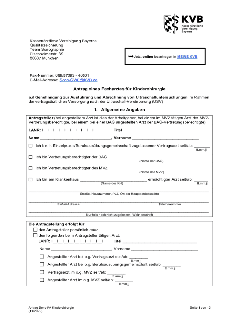 Kassenrztliche Vereinigung Bayerns Qualittssicherung Team Sonographie Elsenheimerstr. 39 80687 MnchenJetzt online beantragen in MEINE KVBFaxNummer: 089/57093 40501 EMailAdresse: SonoGWE@KVB.deAntrag