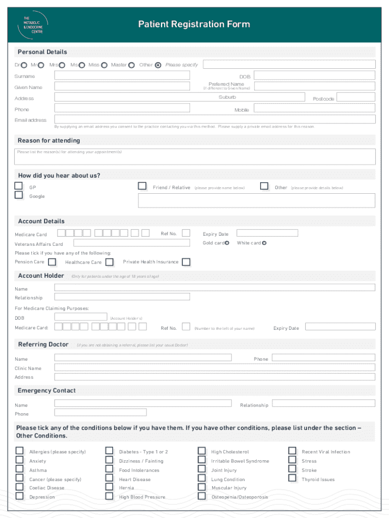 Patient Registration Form Personal Details DrMrMrsMsMissMasterOtherPlease specifySurnameDOB Preferred NameGiven Name(if different to Given Name)SuburbAddress PhonePostcodeMobileEmail address By supplying