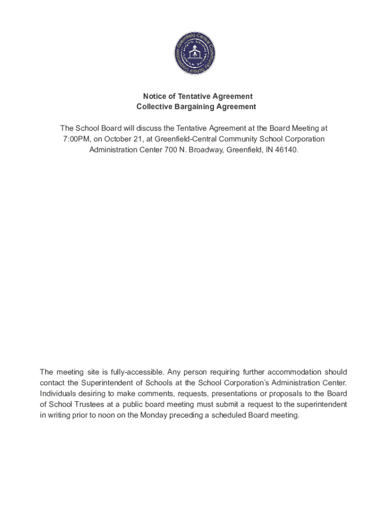 Notice of Tentative Agreement Collective Bargaining Agreement The School Board will discuss the Tentative Agreement at the Board Meeting at 7:00PM, on October 21, at GreenfieldCentral Community School