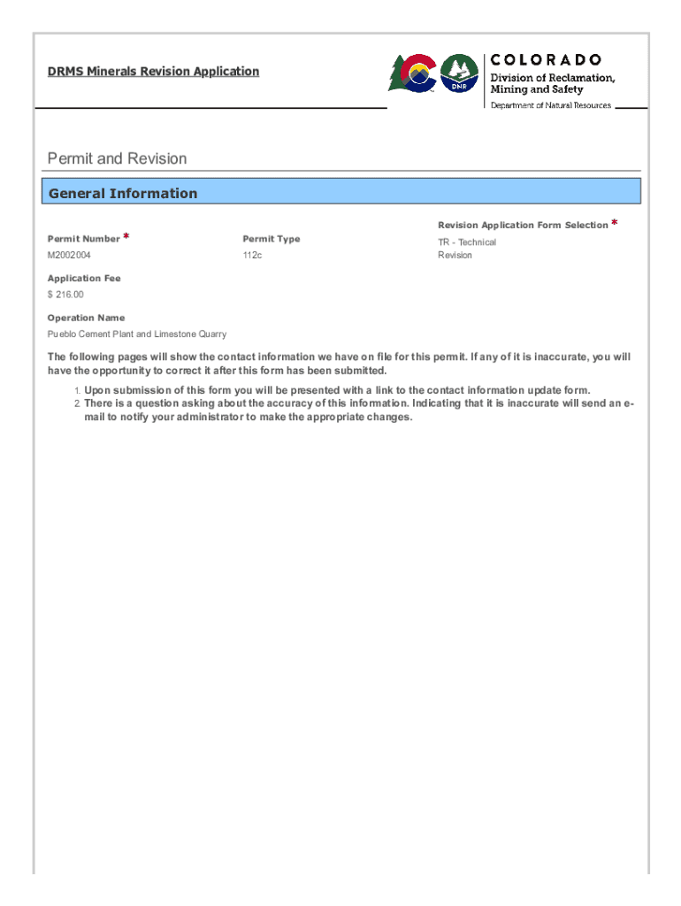 DRMS Minerals Revision ApplicationPermit and Revision General Information Revision Application Form Selection *Permit Number *Permit TypeM2002004112cTR Technical RevisionApplication Fee$ 216.00 Operation