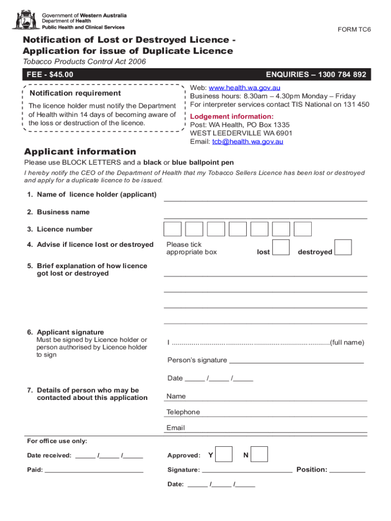 FORM TC6Notification of Lost or Destroyed Licence Application for issue of Duplicate Licence Tobacco Products Control Act 2006 FEE $45.00ENQUIRIES 1300 784 892Notification requirement The licence