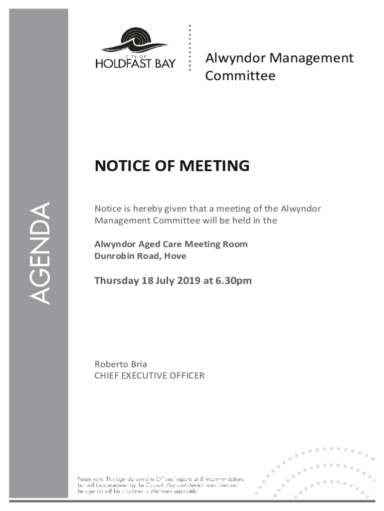 This document provides notice of the Alwyndor Management Committee meeting scheduled for Thursday, 18 July 2019. It includes details about the agenda, traditional acknowledgments, and protocols for meeting conduct. The document emphasizes the importance of acknowledging the Kaurna people and outlines the necessary procedures for the committee members during discussions and decision-making.