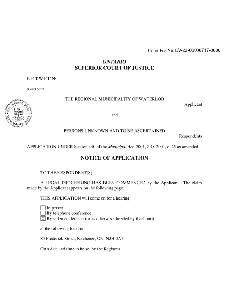 Court File No. CV22000007170000ONTARIO SUPERIOR COURT OF JUSTICE B E T W E E N: (Court Seal)THE REGIONAL MUNICIPALITY OF WATERLOO Applicant andPERSONS UNKNOWN AND TO BE ASCERTAINED Respondents APPLICATION