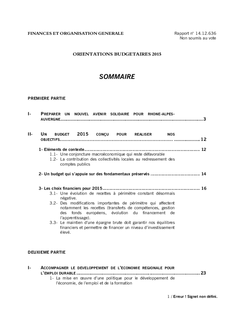 FINANCES ET ORGANISATION GENERALERapport n 14.12.636 Non soumis au voteORIENTATIONS BUDGETAIRES 2015SOMMAIRE PREMIERE PARTIEIPREPARER UN NOUVEL AVENIR SOLIDAIRE POUR RHONEALPESAUVERGNE ...................................................................................................3IIUN2015