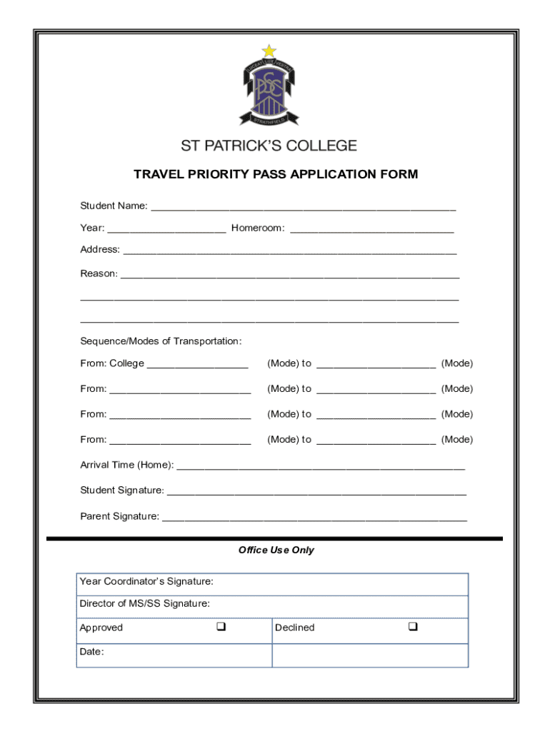 This form is used for students to apply for a Travel Priority Pass, allowing them to outline their travel plans, transportation modes, and obtain necessary signatures from parents and school officials.