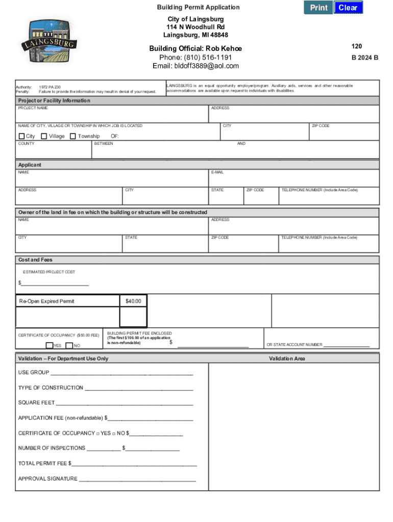 This document is a building permit application for construction projects in the City of Laingsburg, Michigan. It includes sections for applicant information, project details, cost estimation, and compliance with local building codes. The application also addresses requirements for inspections, certificates of occupancy, and environmental approvals.