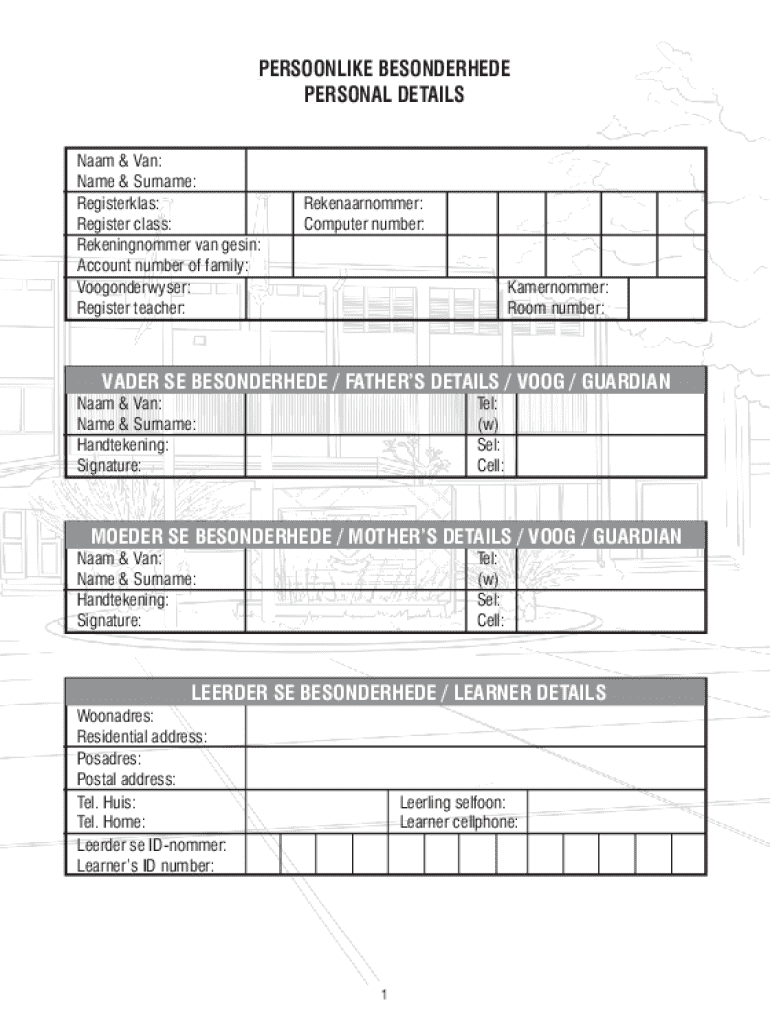 PERSOONLIKE BESONDERHEDE PERSONAL DETAILS Naam & Van: Name & Surname: Registerklas: Register class: Rekeningnommer van gesin: Account number of family: Voogonderwyser: Register teacher:Rekenaarnommer: