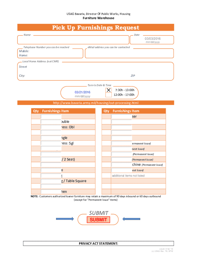 This document is a request form for picking up furnishings from the USAG Bavaria Furniture Warehouse. It includes sections for personal information, contact details, and a list of available furnishings items, along with guidelines for the duration of loaner furniture retention.