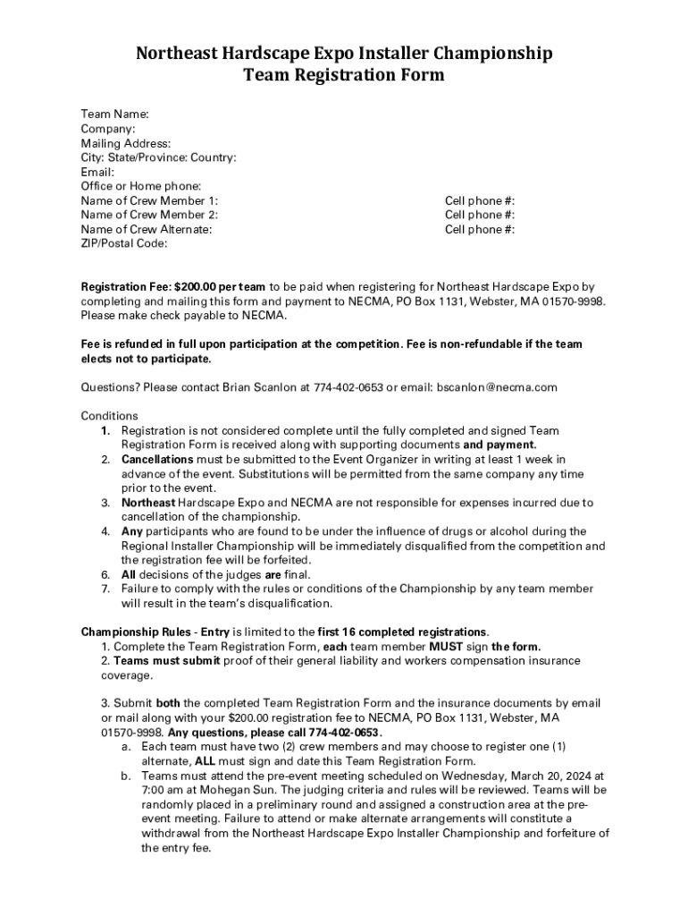 Northeast Hardscape Expo Installer Championship Team Registration Form Team Name: Company: Mailing Address: City: State/Province: Country: Email: Office or Home phone: Name of Crew Member 1: Name