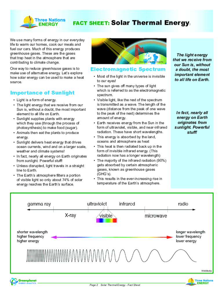 This fact sheet provides an overview of solar thermal energy, including the importance of sunlight, how light transforms into heat, and various applications of solar thermal energy such as heating, cooking, and industrial uses. It also explains concepts like the electromagnetic spectrum and albedo.