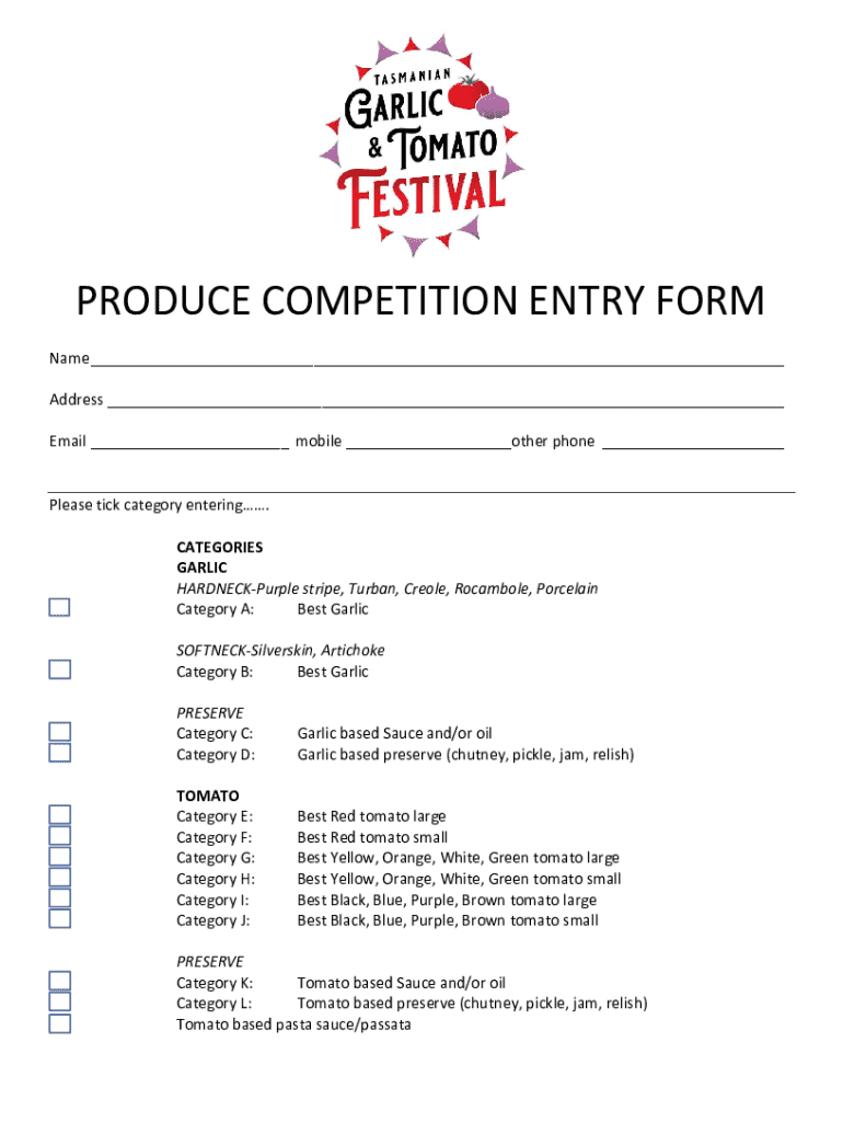 PRODUCE COMPETITION ENTRY FORM Name ___ Address ___ Email ___ mobile ___other phone ___Please tick category entering. CATEGORIES GARLIC HARDNECKPurple stripe, Turban, Creole, Rocambole, Porcelain