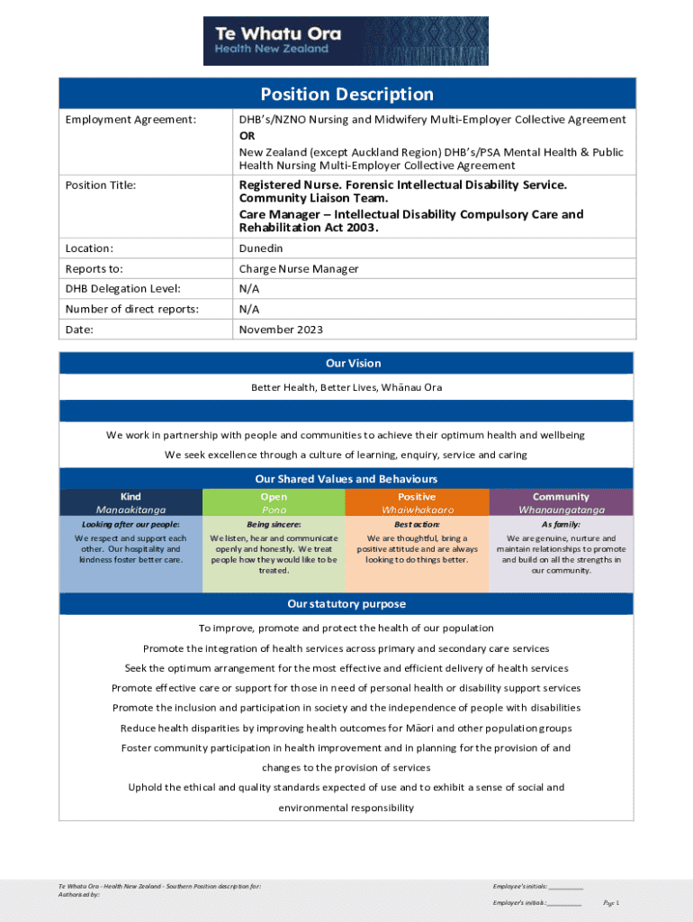 Position Description Employment Agreement:DHBs/NZNO Nursing and Midwifery MultiEmployer Collective Agreement OR New Zealand (except Auckland Region) DHBs/PSA Mental Health & Public Health Nursing