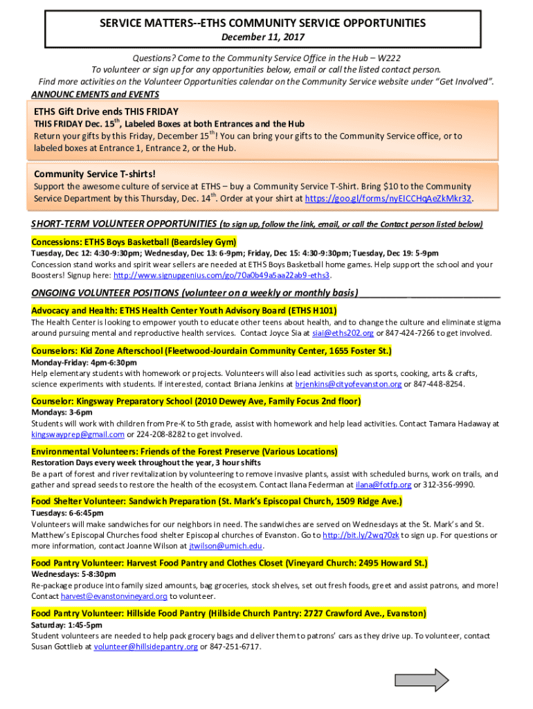 SERVICE MATTERSETHS COMMUNITY SERVICE OPPORTUNITIES December 11, 2017 Questions? Come to the Community Service Office in the Hub W222 To volunteer or sign up for any opportunities below, email or