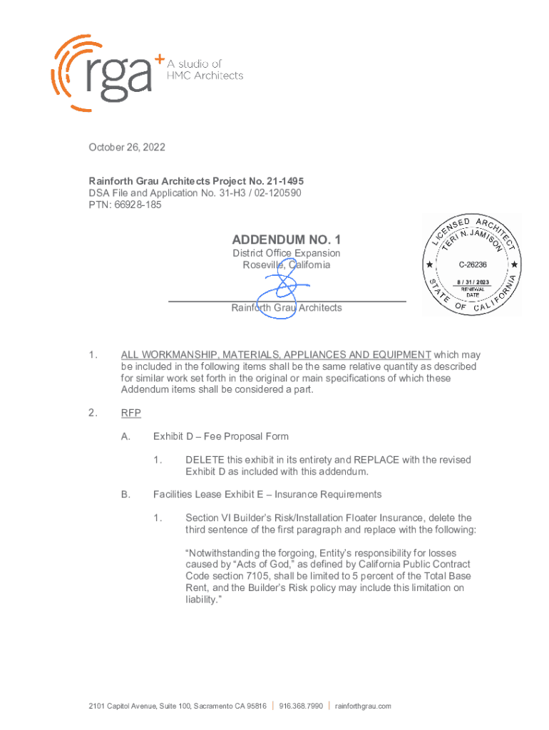 October 26, 2022 Rainforth Grau Architects Project No. 211495 DSA File and Application No. 31H3 / 02120590 PTN: 66928185ADDENDUM NO. 1 District Office Expansion Roseville, California 8 / 31 / 2023Rainforth