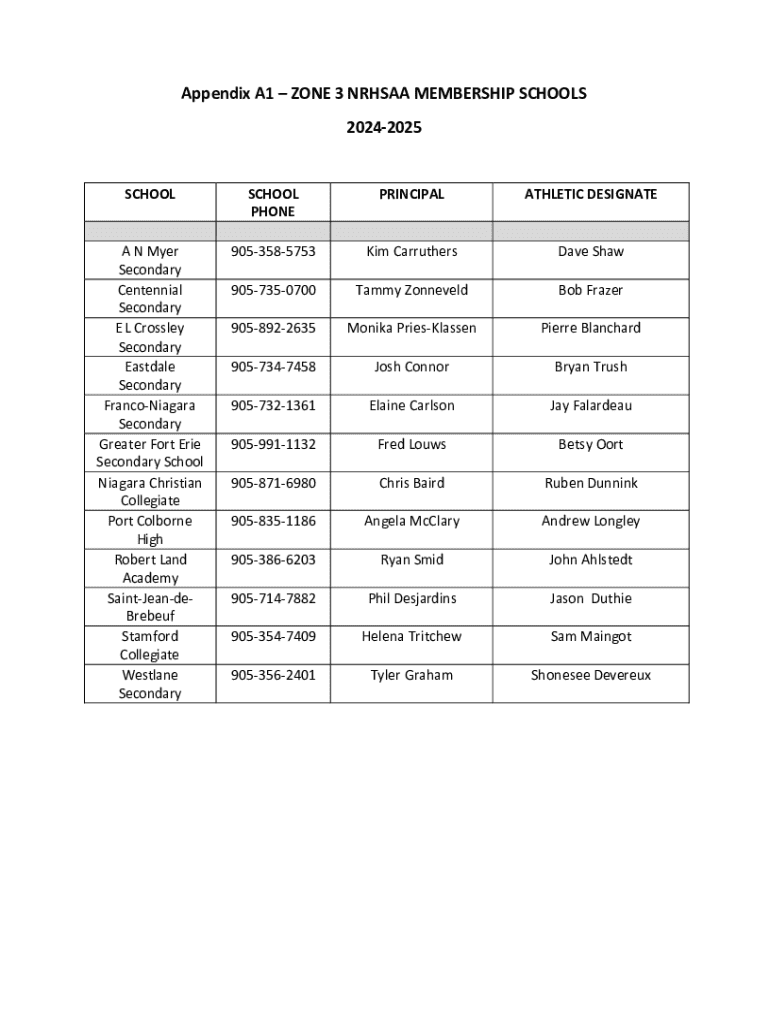 Appendix A1 ZONE 3 NRHSAA MEMBERSHIP SCHOOLS 20242025SCHOOLSCHOOL PHONEPRINCIPALATHLETIC DESIGNATEA N Myer Secondary Centennial Secondary E L Crossley Secondary Eastdale Secondary FrancoNiagara Secondary