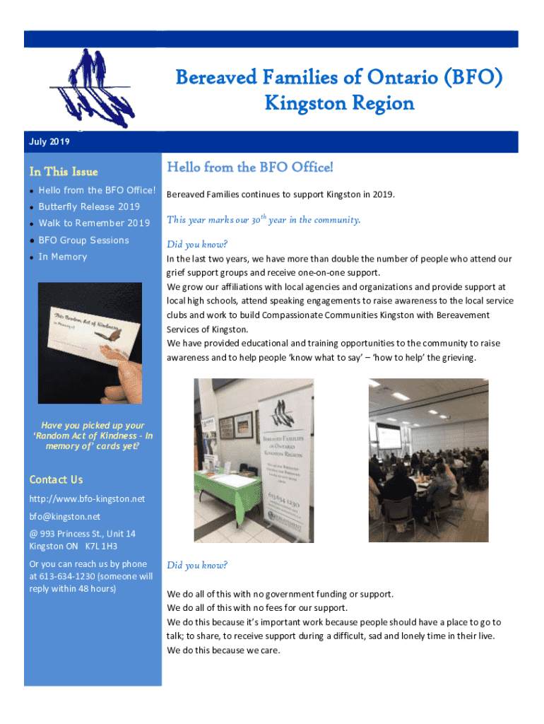 Bereaved Families of Ontario (BFO) Kingston Region July 2019In This Issue Hello from the BFO Office!Butterfly Release 2019Walk to Remember 2019 BFO Group Sessions In MemoryHello from the BFO Office!