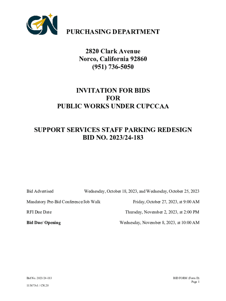 PURCHASING DEPARTMENT 2820 Clark Avenue Norco, California 92860 (951) 7365050 INVITATION FOR BIDS FOR PUBLIC WORKS UNDER CUPCCAA SUPPORT SERVICES STAFF PARKING REDESIGN BID NO. 2023/24183Bid AdvertisedWednesday,