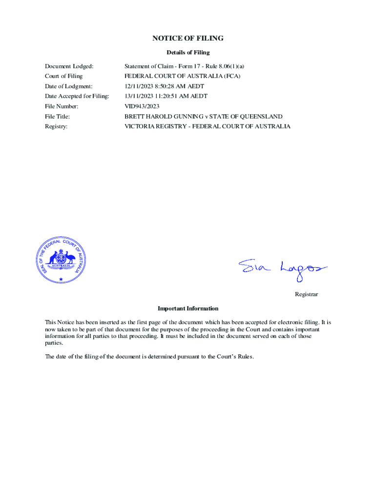 NOTICE OF FILING Details of Filing Document Lodged:Statement of Claim Form 17 Rule 8.06(1)(a)Court of FilingFEDERAL COURT OF AUSTRALIA (FCA)Date of Lodgment:12/11/2023 8:50:28 AM AEDTDate Accepted