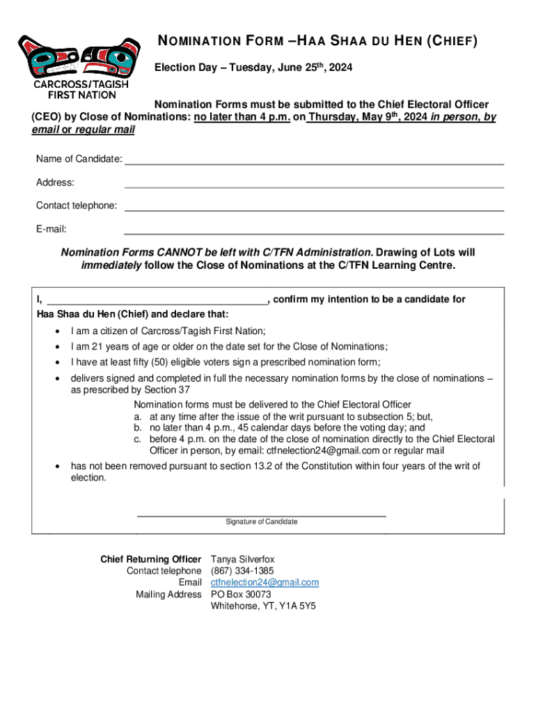 N OMINATION F ORM H AA S HAA DU H EN (C HIEF ) Election Day Tuesday, June 25th, 2024Nomination Forms must be submitted to the Chief Electoral Officer (CEO) by Close of Nominations: no later than 4