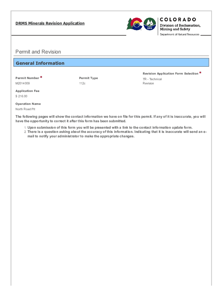DRMS Minerals Revision ApplicationPermit and Revision General Information Revision Application Form Selection *Permit Number *Permit TypeM2014009112cTR Technical RevisionApplication Fee$ 216.00 Operation