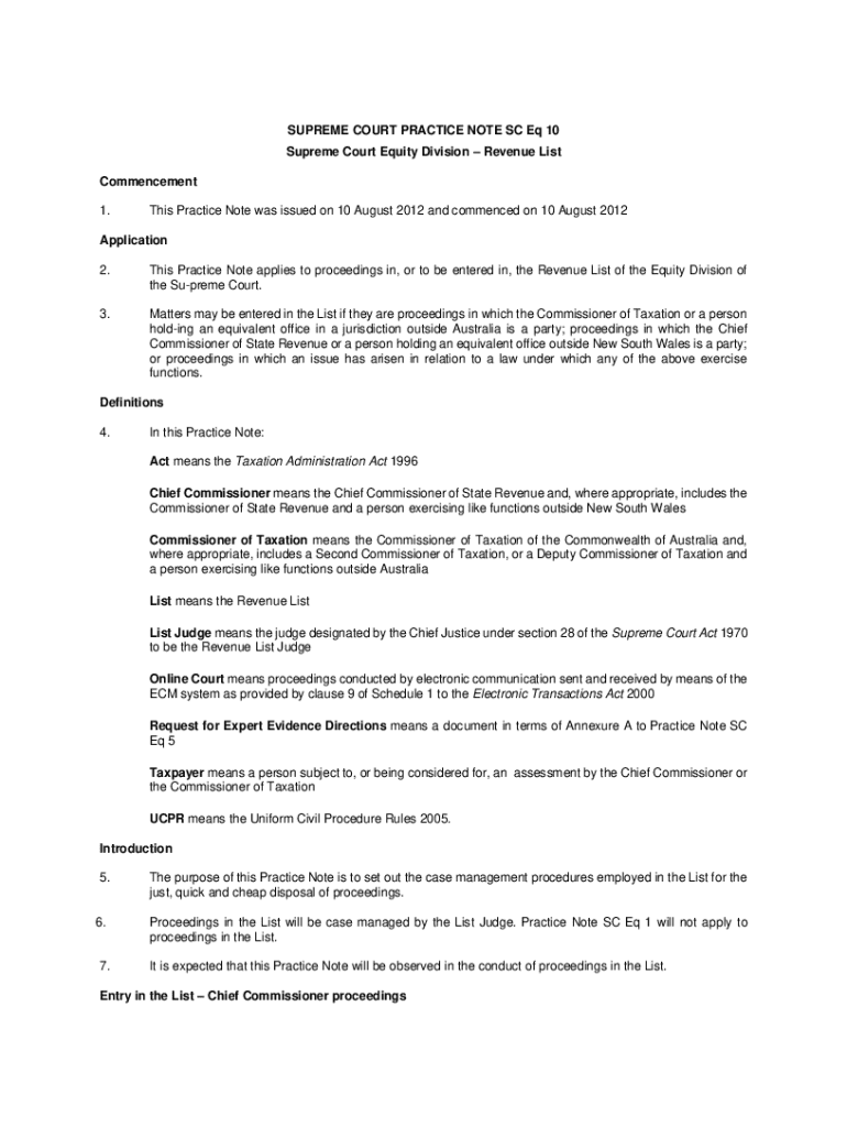 This Practice Note outlines the procedures for case management in the Revenue List of the Equity Division of the Supreme Court of New South Wales, aimed at ensuring just, quick, and cost-effective resolution of proceedings involving tax-related matters.