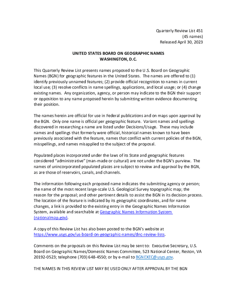Quarterly Review List 451 (45 names) Released April 30, 2023 UNITED STATES BOARD ON GEOGRAPHIC NAMES WASHINGTON, D.C. This Quarterly Review List presents names proposed to the U.S. Board on Geographic