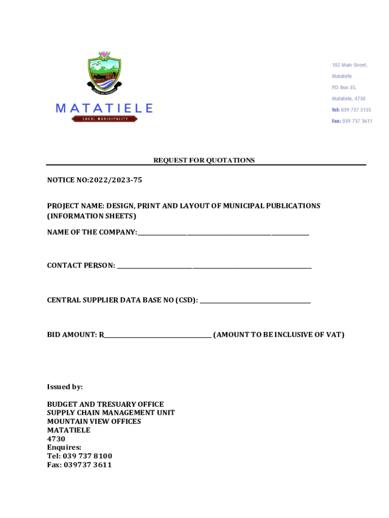 REQUEST FOR QUOTATIONSNOTICE NO:2022/202375 PROJECT NAME: DESIGN, PRINT AND LAYOUT OF MUNICIPAL PUBLICATIONS (INFORMATION SHEETS) NAME OF THE COMPANY:___CONTACT PERSON: ___CENTRAL SUPPLIER DATA BASE