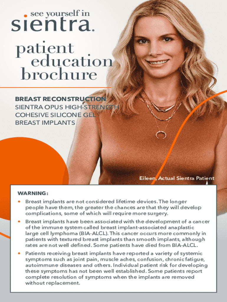 patient education brochure BREAST RECONSTRUCTION SIENTRA OPUS HIGHSTRENGTH COHESIVE SILICONE GEL BREAST IMPLANTSEileen, Actual Sientra Patient WARNING: Breast implants are not considered lifetime