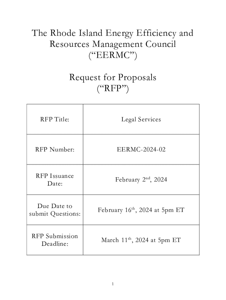 The Rhode Island Energy Efficiency and Resources Management Council (EERMC) is soliciting proposals from qualified offerors to provide legal services beginning May 1, 2024. The selected offeror will assist the EERMC in fulfilling its statutory obligations regarding energy efficiency, conservation, and resource management, as well as representation in regulatory proceedings.