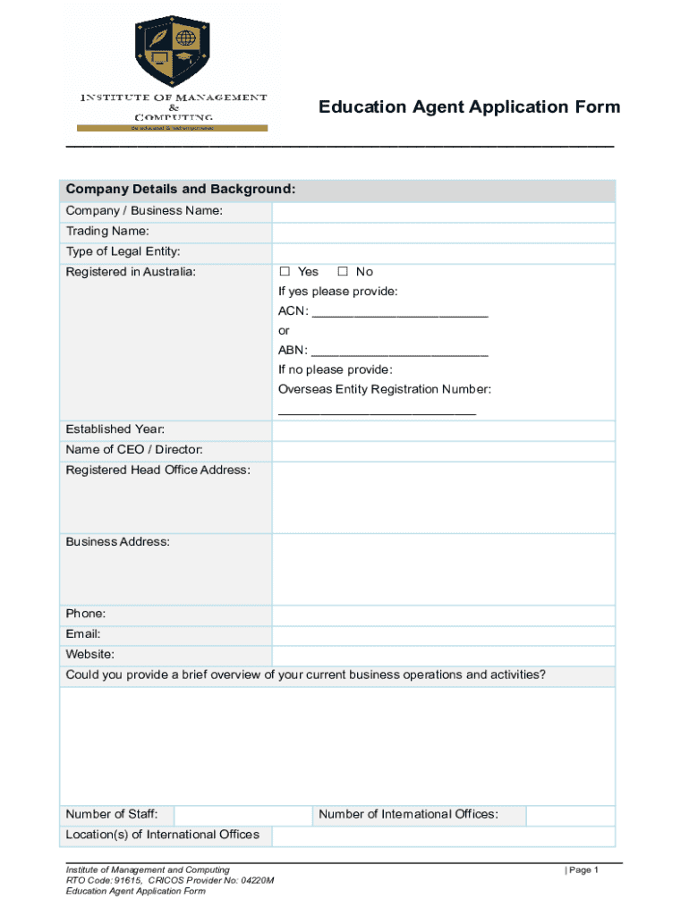 This form is designed for education agents to apply for representation with the Institute of Management and Computing. It collects information regarding the agent\'s company details, staff qualifications, agency performance, compliance with relevant legislation, and references. The aim is to evaluate the agent\'s capacity to promote and represent the Institute\'s courses and support prospective students.