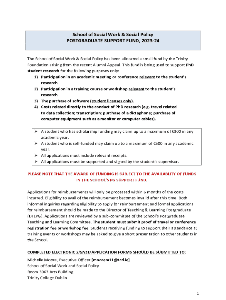 School of Social Work & Social Policy POSTGRADUATE SUPPORT FUND, 202324The School of Social Work & Social Policy has been allocated a small fund by the Trinity Foundation arising from the recent Alumni