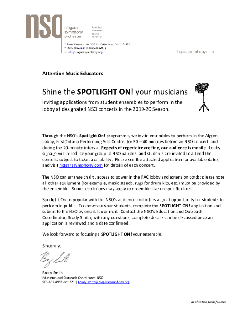 Attention Music EducatorsShine the SPOTLIGHT ON! your musicians Inviting applications from student ensembles to perform in the lobby at designated NSO concerts in the 201920 Season.Through the NSOs