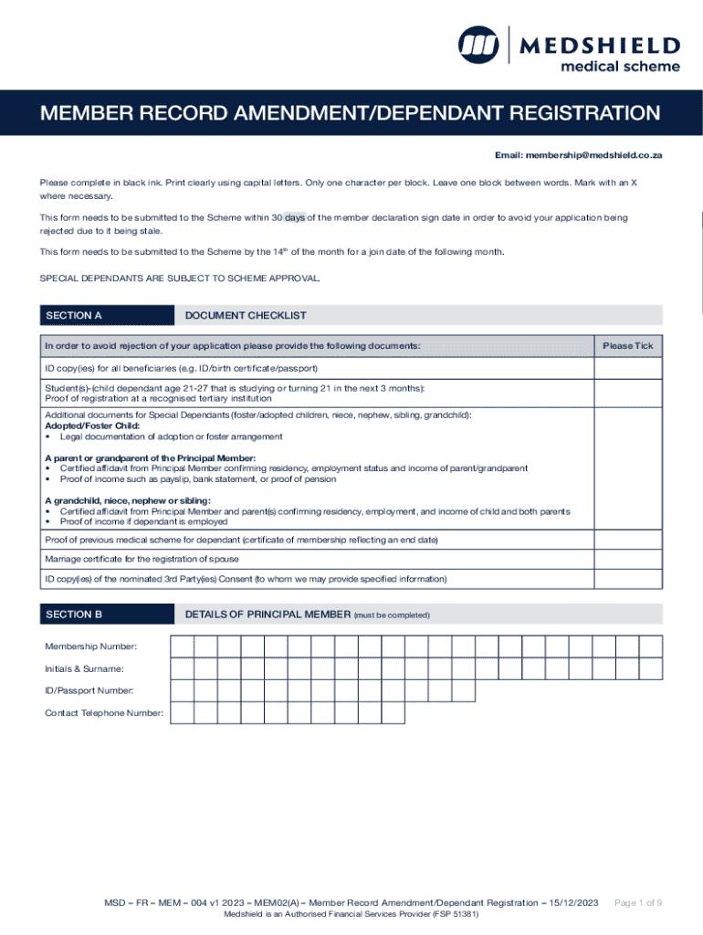 This document is an application form for amending member records or registering dependants within the Medshield Medical Scheme. It outlines the necessary steps, required documentation, and conditions for submission to ensure processing within specified timeframes. The form includes sections for personal information, dependant registration, previous medical aid history, and a declaration of consent for processing personal information.