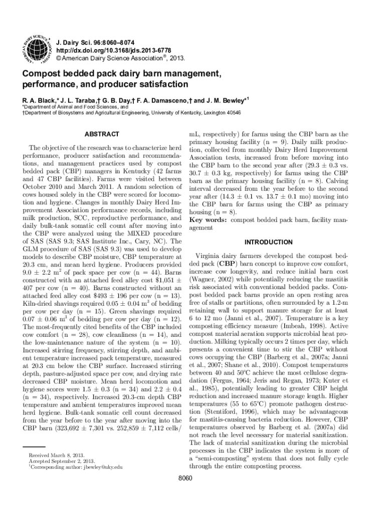 J. Dairy Sci. 96:80608074 http://dx.doi.org/10.3168/jds.20136778 American Dairy Science Association, 2013.Compost bedded pack dairy barn management, performance, and producer satisfaction R. A. Black,*