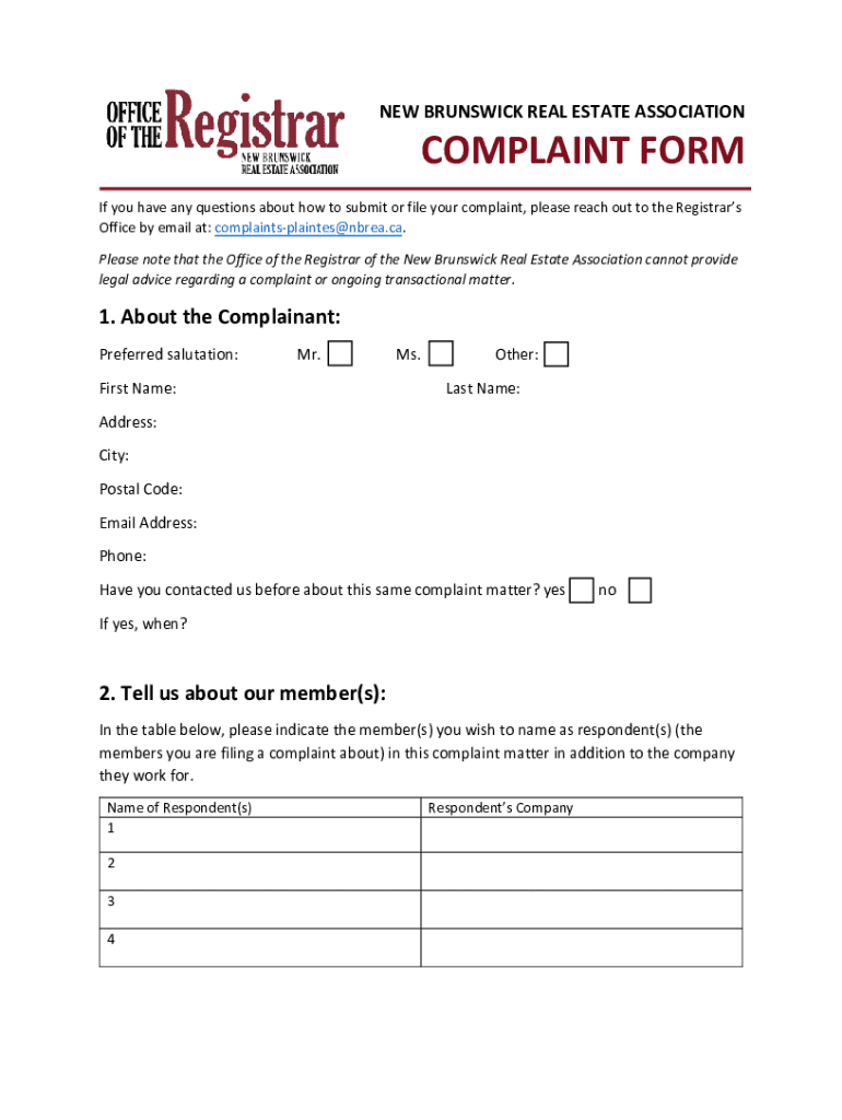 NEW BRUNSWICK REAL ESTATE ASSOCIATIONCOMPLAINT FORM If you have any questions about how to submit or file your complaint, please reach out to the Registrars Office by email at: complaintsplaintes@nbrea.ca.