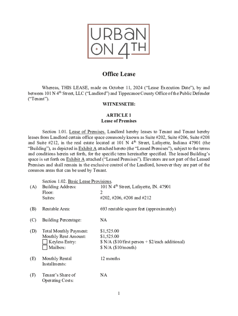 Office Lease Whereas, THIS LEASE, made on October 11, 2024 (Lease Execution Date), by and between 101 N 4th Street, LLC (Landlord) and Tippecanoe County Office of the Public Defender (Tenant). WITNESSETH: