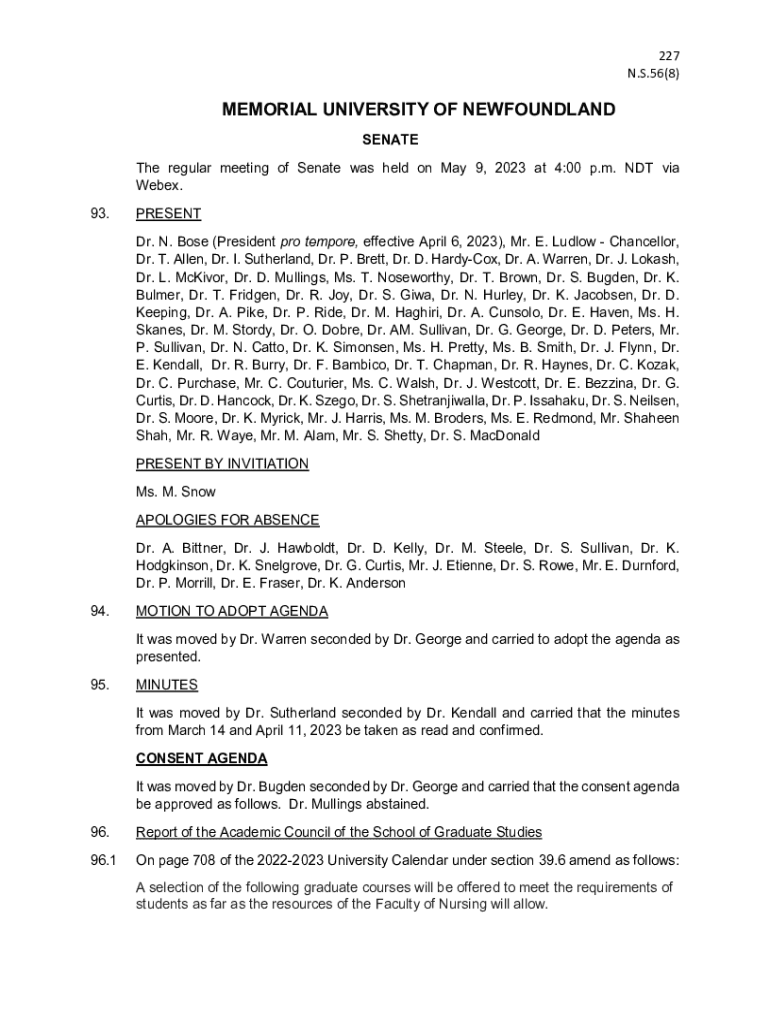 227 N.S.56(8)MEMORIAL UNIVERSITY OF NEWFOUNDLAND SENATE The regular meeting of Senate was held on May 9, 2023 at 4:00 p.m. NDT via Webex. 93.PRESENT Dr. N. Bose (President pro tempore, effective April