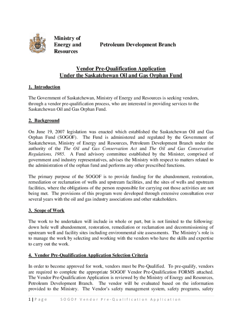 Ministry of Energy and ResourcesPetroleum Development BranchVendor PreQualification Application Under the Saskatchewan Oil and Gas Orphan Fund 1. Introduction The Government of Saskatchewan, Ministry