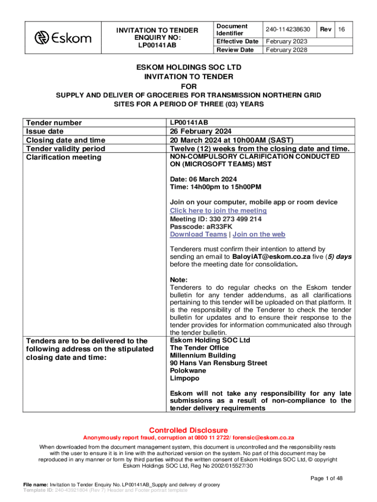 INVITATION TO TENDER ENQUIRY NO: LP00141ABDocument Identifier Effective Date Review Date240114238630Rev16February 2023 February 2028ESKOM HOLDINGS SOC LTD INVITATION TO TENDER FOR SUPPLY AND DELIVER
