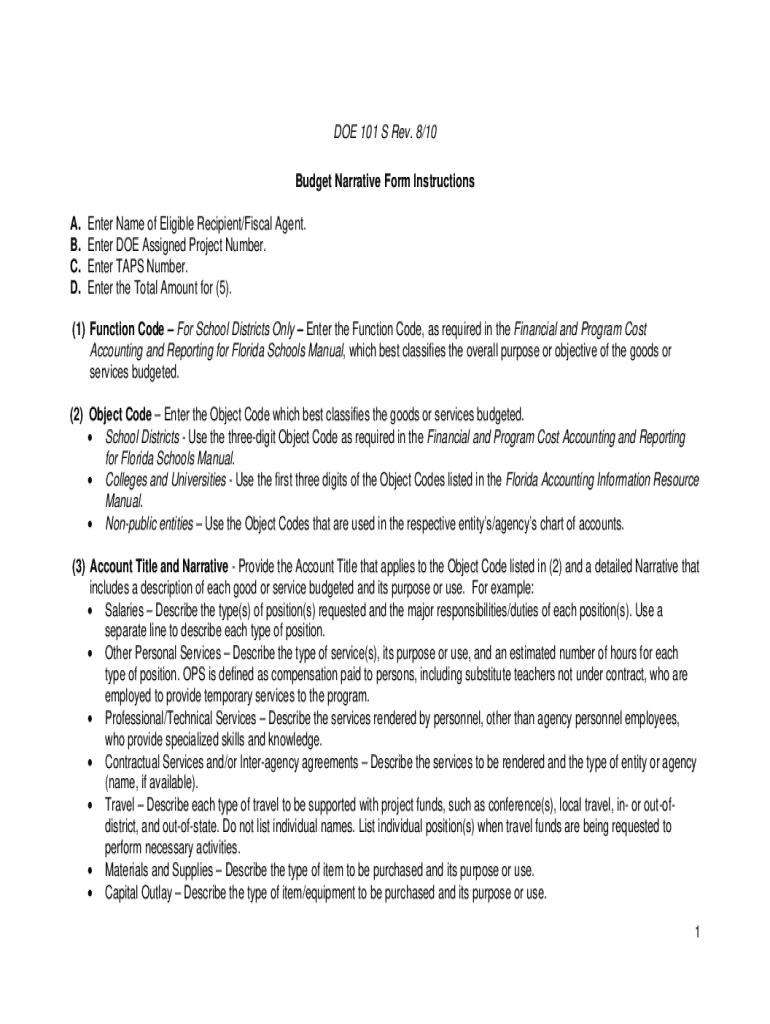 DOE 101 S Rev. 8/10 Budget Narrative Form Instructions A. B. C. D.Enter Name of Eligible Recipient/Fiscal Agent. Enter DOE Assigned Project Number. Enter TAPS Number. Enter the Total Amount for (5).(1)